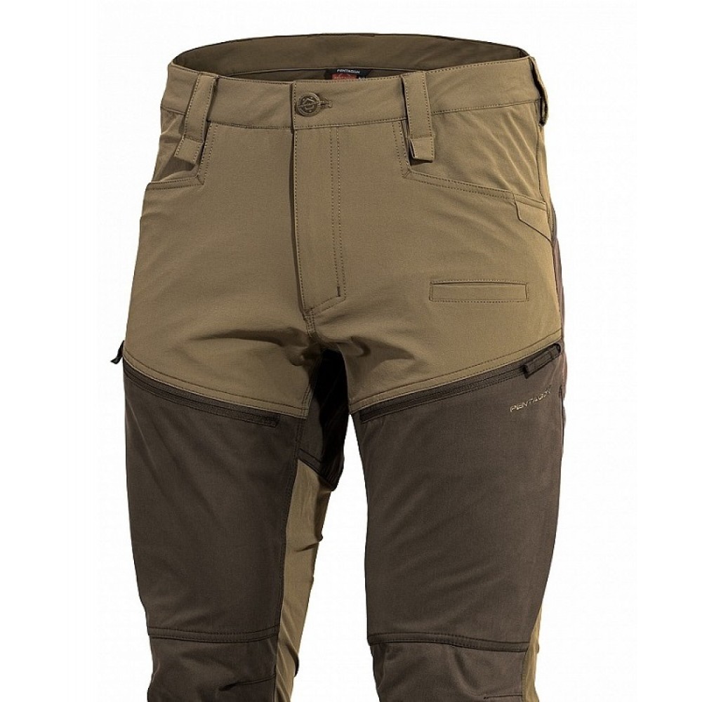 Брюки Renegade Savanna Pants изготовлены фирмой Pentagon® в комбинации из эластичной нейлоновой ткани Soft Shell и смесовой ткани Canvas, в контрастном цветовом исполнении. Материалы получили дополнительную водоотталкивающую пропитку DWR 4 класса для защиты от намокания в дождливую погоду.