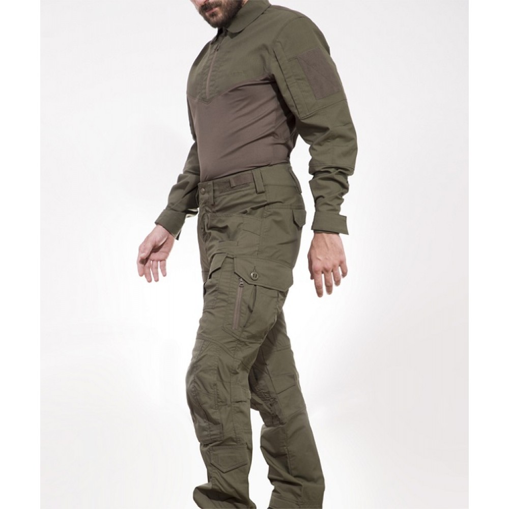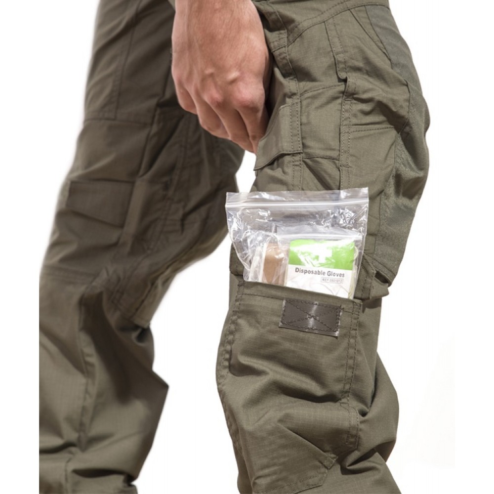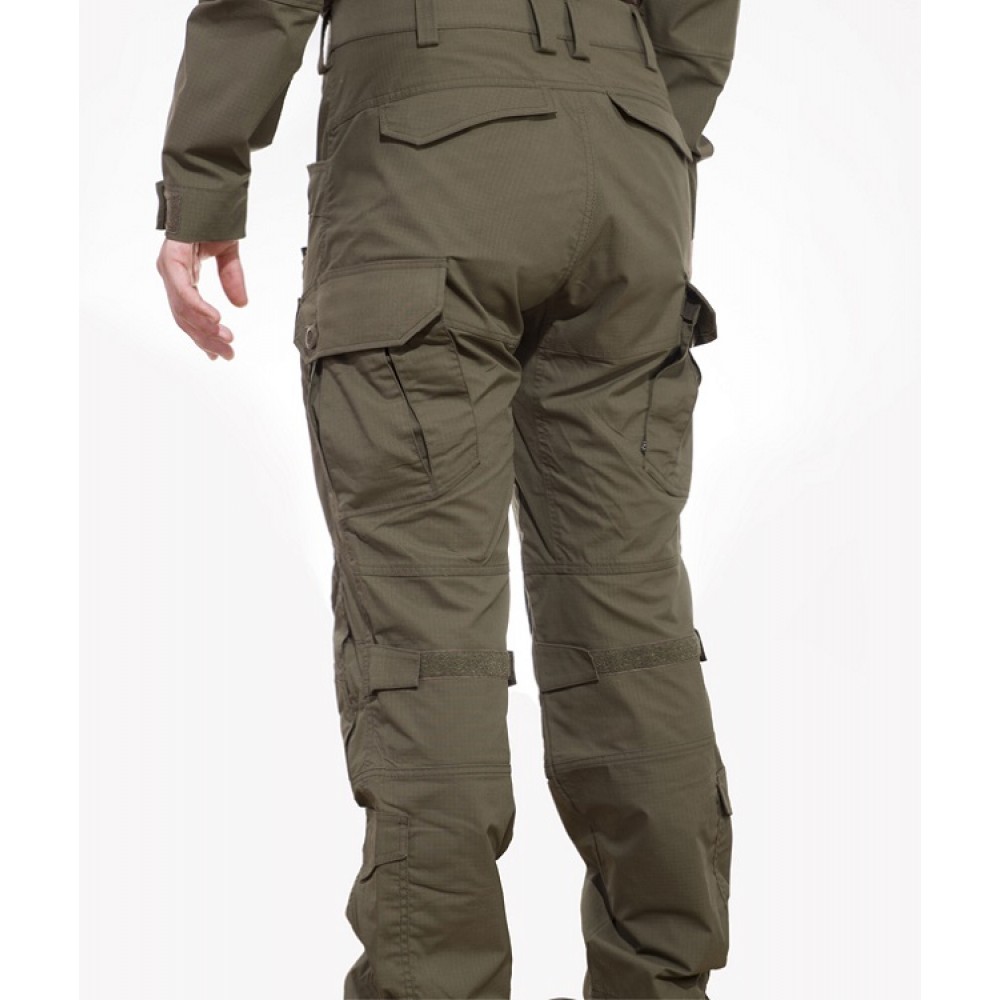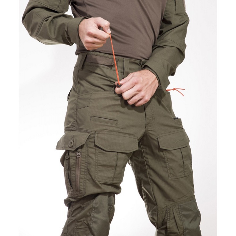 - Срезы передних карманов имеют усиливающие накладки, препятствующие истиранию при ношении ножа, фонарика или другого снаряжения на клипсе. Боковые карго-карманы оснащены внутренними карманами для магазинов к оружию и боковым входом быстрого доступа на молнии.