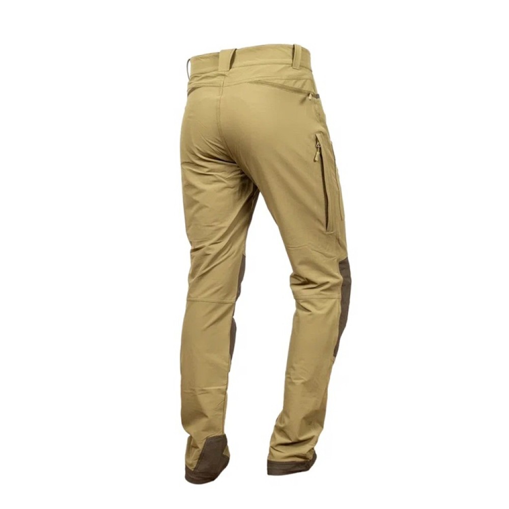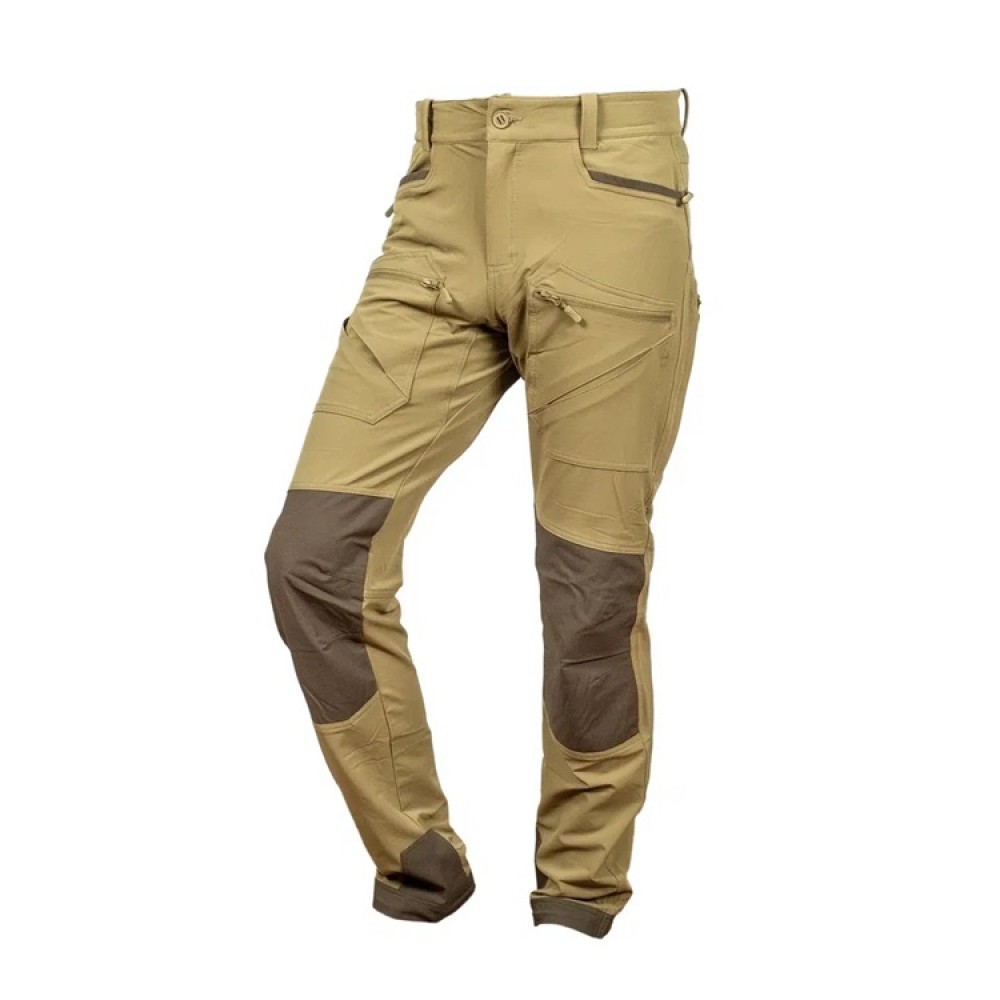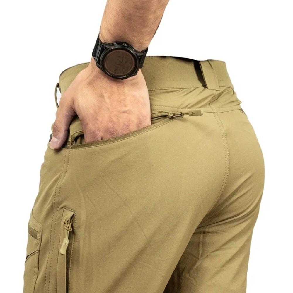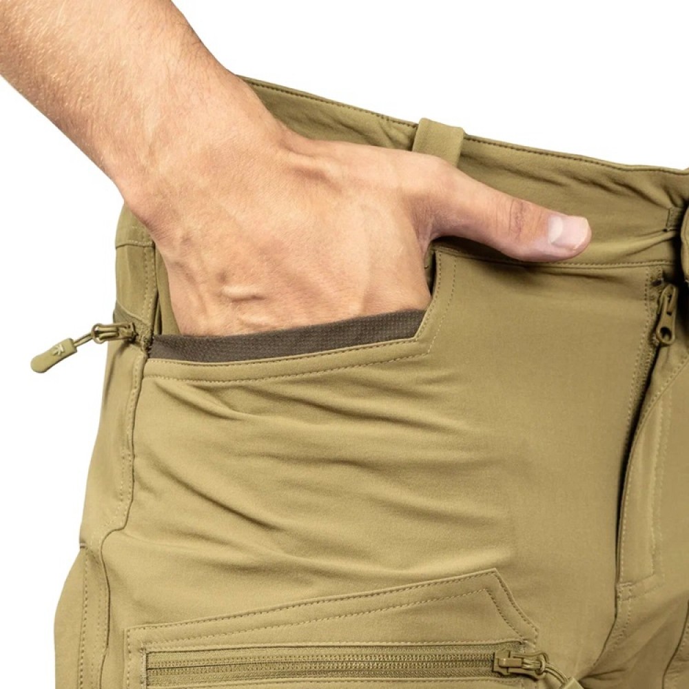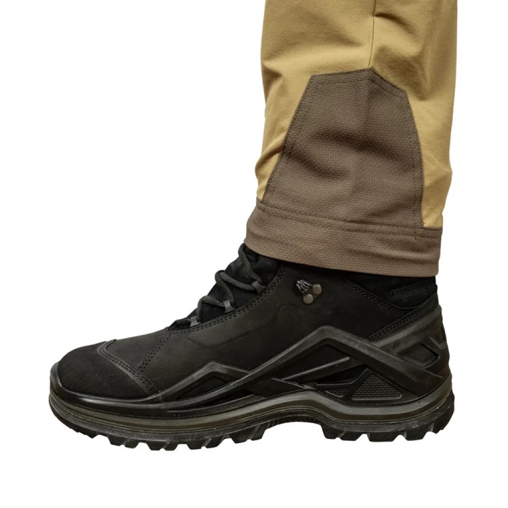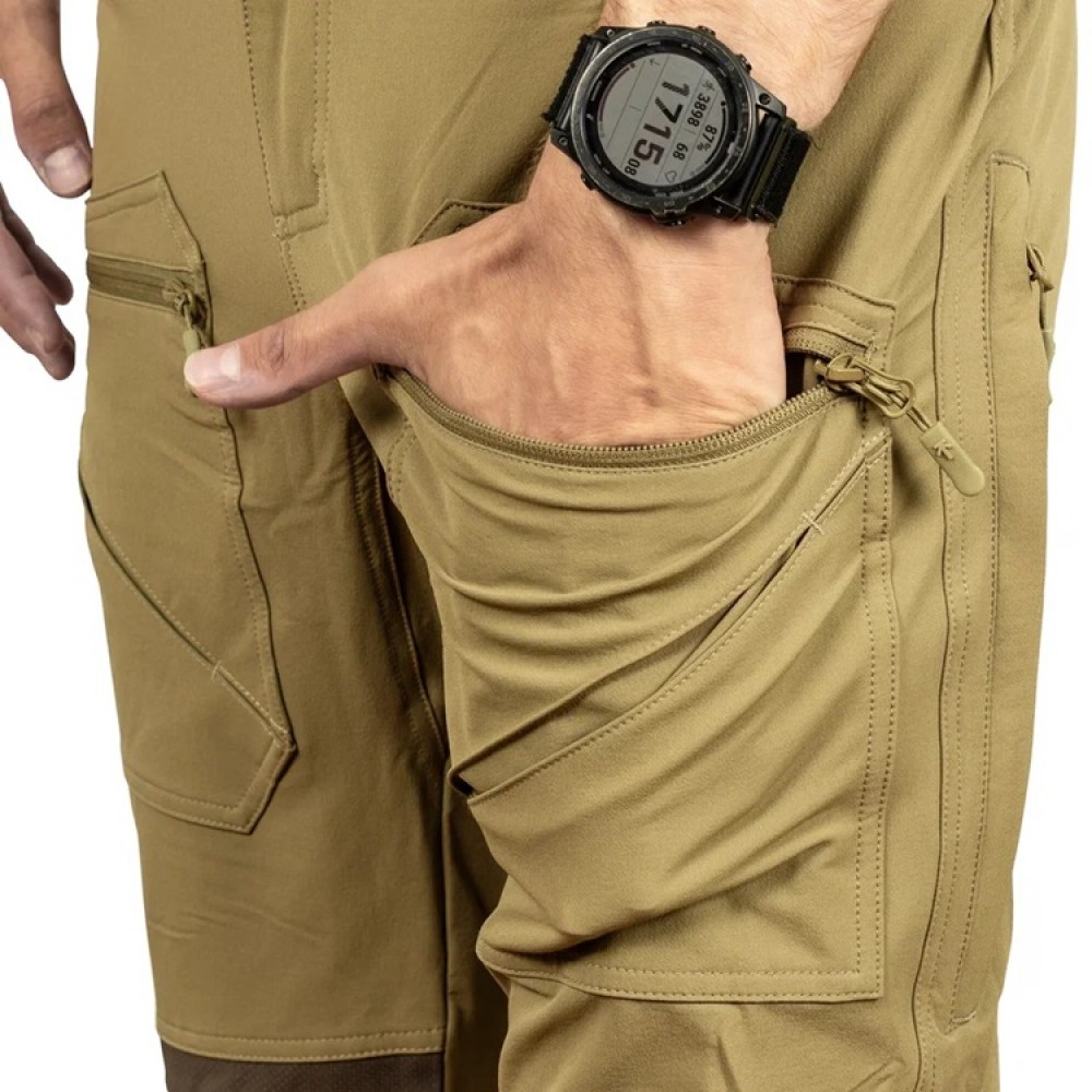 Низкопрофильные набедренные карманы выполнены накладными, закрываются на молнию, и предназначены, для документов или других плоских предметов, необъемных аксессуаров. Боковые карманы с прямым усиленным устьем, тыльные карманы на молнии. Усиненные вставки из нейлона 480D с PU покрытием в области коленей и в области лодыжек с внутренней стороны. Низ брюк фиксируется к шнуркам обуви для предотвращения его задирания крючком на эластичном ходу.