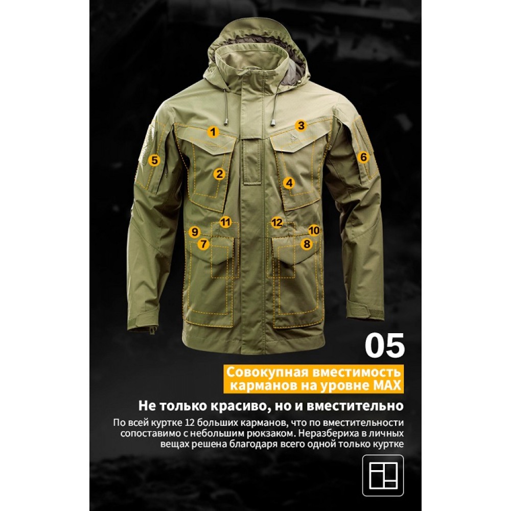 Комплект из 12 вместительных карманов позволяет унести на себе множество необходимого снаряжения. Четыре нагрудных кармана, два из которых под клапанами на велкро и два скрытых на молнии с боковым входом; четыре нижних кармана, из них два с магнитным клапаном и два скрытых на молнии; два кармана на молнии на рукавах и два открытых сетчатых кармана на внутренней части куртки.