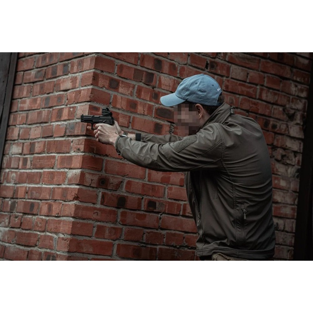 Материал куртки Gunfighter Soft Shell тактильно приятен, анатомический крой не стесняет активных движений в динамичных миссиях, а усиление рукавов в области локтей и предплечий накладками из второго слоя ткани повышает износостойкость одежды.