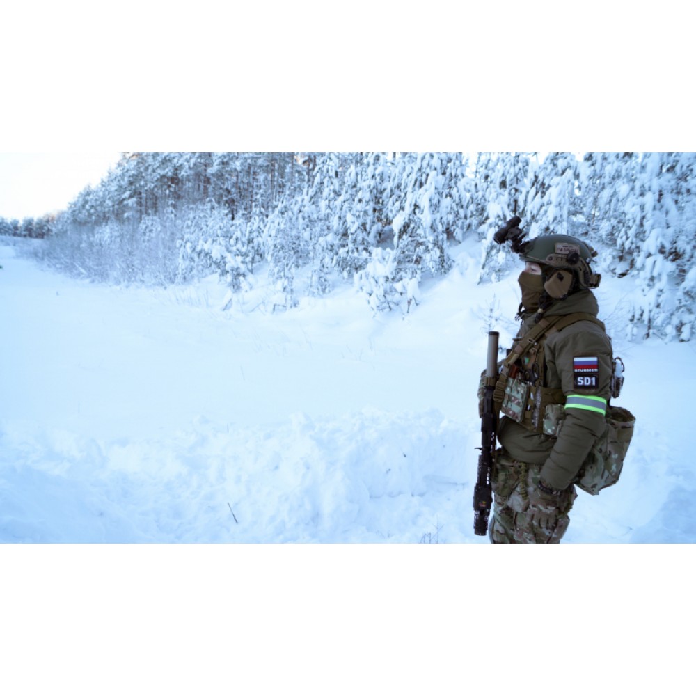 Выполнена из армированной полиамидной ткани микро-RipStop с водоотталкивающей PU-пропиткой. Наполнитель — отечественный каландрированный утеплитель FiberSoft из перевитых силиконизированных первичных микроволокон. Он обладает повышенным тепловым сопротивлением и водоотталкивающими свойствами.