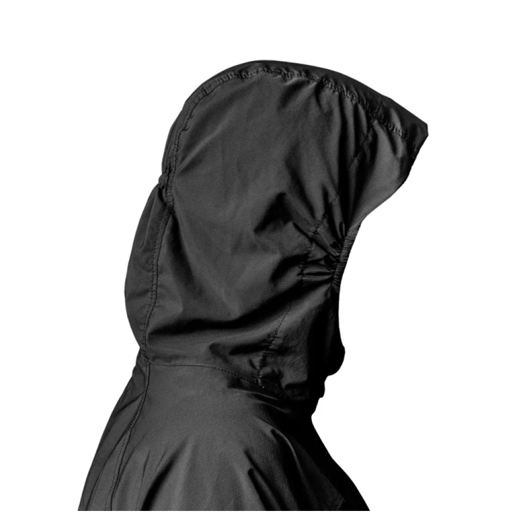 Эластичная окантовка по низу куртки, на манжетах эффективно защищает от ветра. Капюшон подрезинен по бокам овала лица и на затылке. Ветровка имеет два боковых кармана и один нагрудный на молниях.