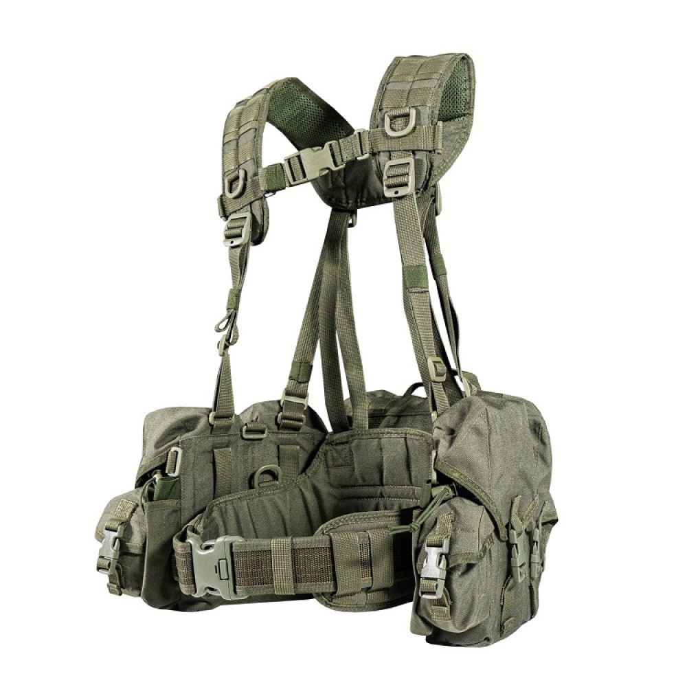 - Для защиты от потёртостей, в мягкий пояс укладывается изолоновый амортизатор толщиной 5 мм. Для равномерного распределения нагрузки между плечами и поясницей поясной ремень поддерживается в шести точках плечевыми лямками. Ременные петли лямок сначала пропускаются в D-образные кольца на магазинных сумках, малом боевом ранце (если он висит на пояснице) или мягком поясе, а затем продеваются в трёхщелевые регулировочные пряжки, свободные концы ремней заправляются под пряжки-двухщелёвки и муфты из резинки.