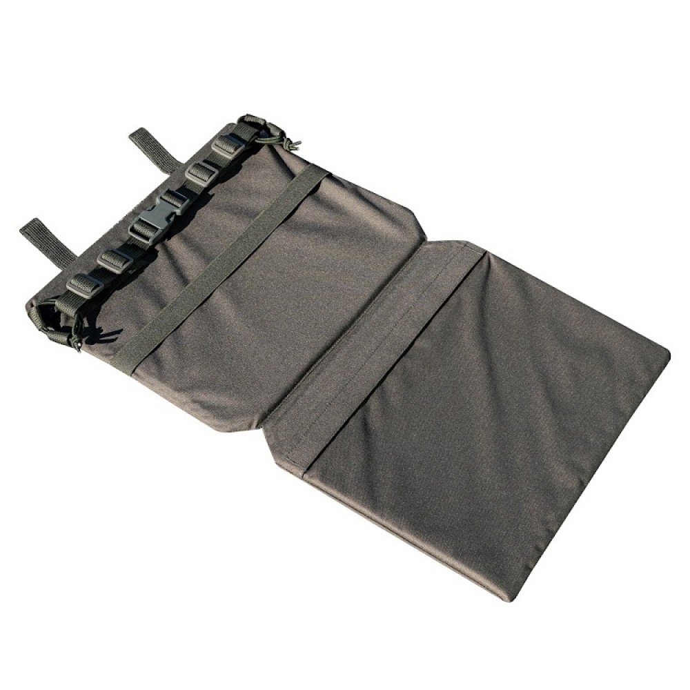 Двухсекционное сидение-пятиточечник Sturmer Folder предназначено для размещения одного или двух баллистических пакетов, которые защищают поясницу, таз и ноги от осколков. Сиденье можно закрепить тремя способами: на MOLLE-платформу бронежилета или пояса, а также как классическую сидушку с помощью поясной стропы. В этом случае его можно будет повернуть вперед и использовать как небольшой коврик для засады или подложить под спину для короткого отдыха. Базовая комплектация включает две вставки из изолона, которые обеспечивают комфорт и теплоизоляцию, а также один баллистический пакет класса защиты БР1 в верхней секции.