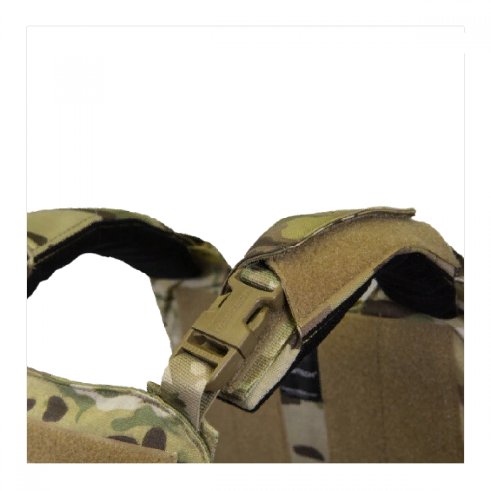 - На левой плечевой лямке фастекс для более быстрого и удобного расстёгивания жилета;