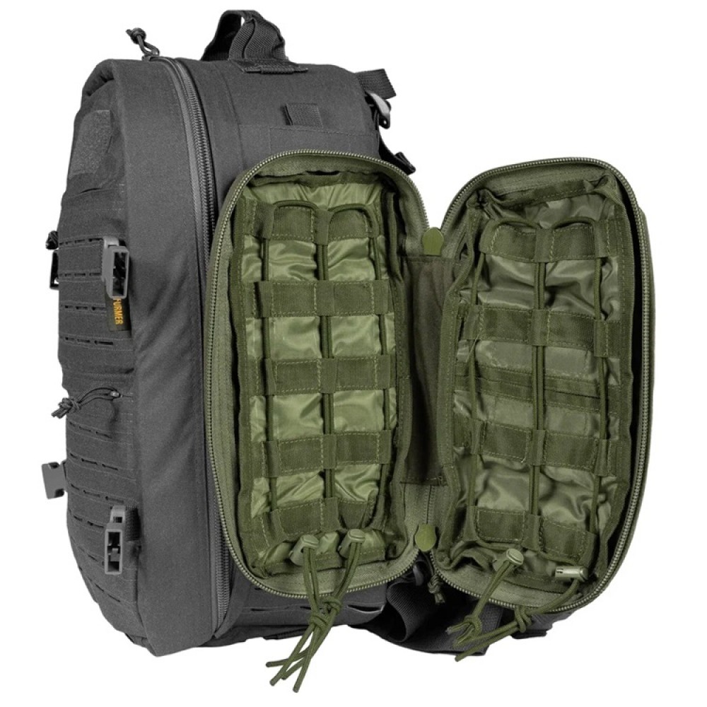 MOLLE / PALS интерфейс внешней панели рюкзака выполнен по технологии лазерной резки и позволяет размещать дополнительные подсумки и снаряжение.