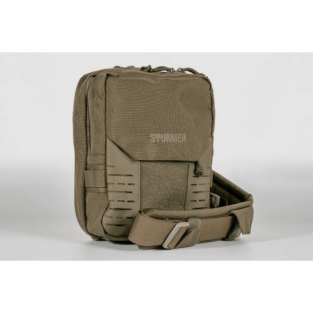 Сумка изготовлена из прочной кордуры плотностью 1000D с инфракрасной ремиссией (IRR) и водоотталкивающей пропиткой (WR), удобна для ношения на груди через правое плечо. Регулируемый по длине наплечный ремень оборудован съёмной мягкой накладкой.