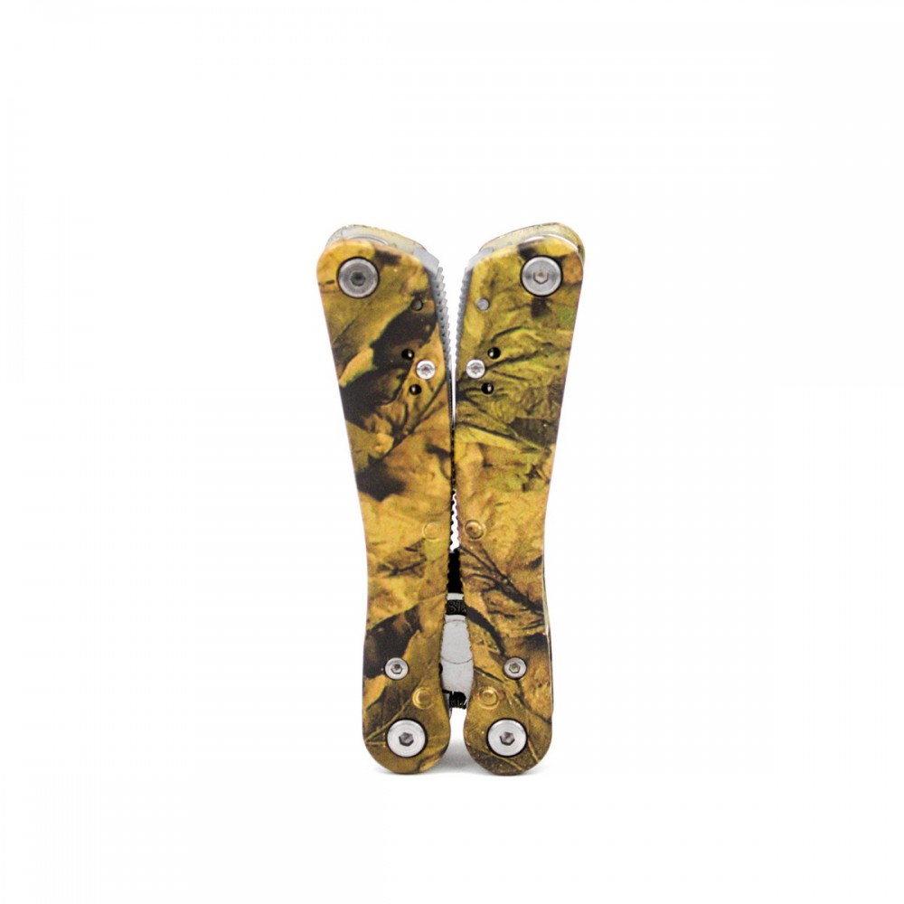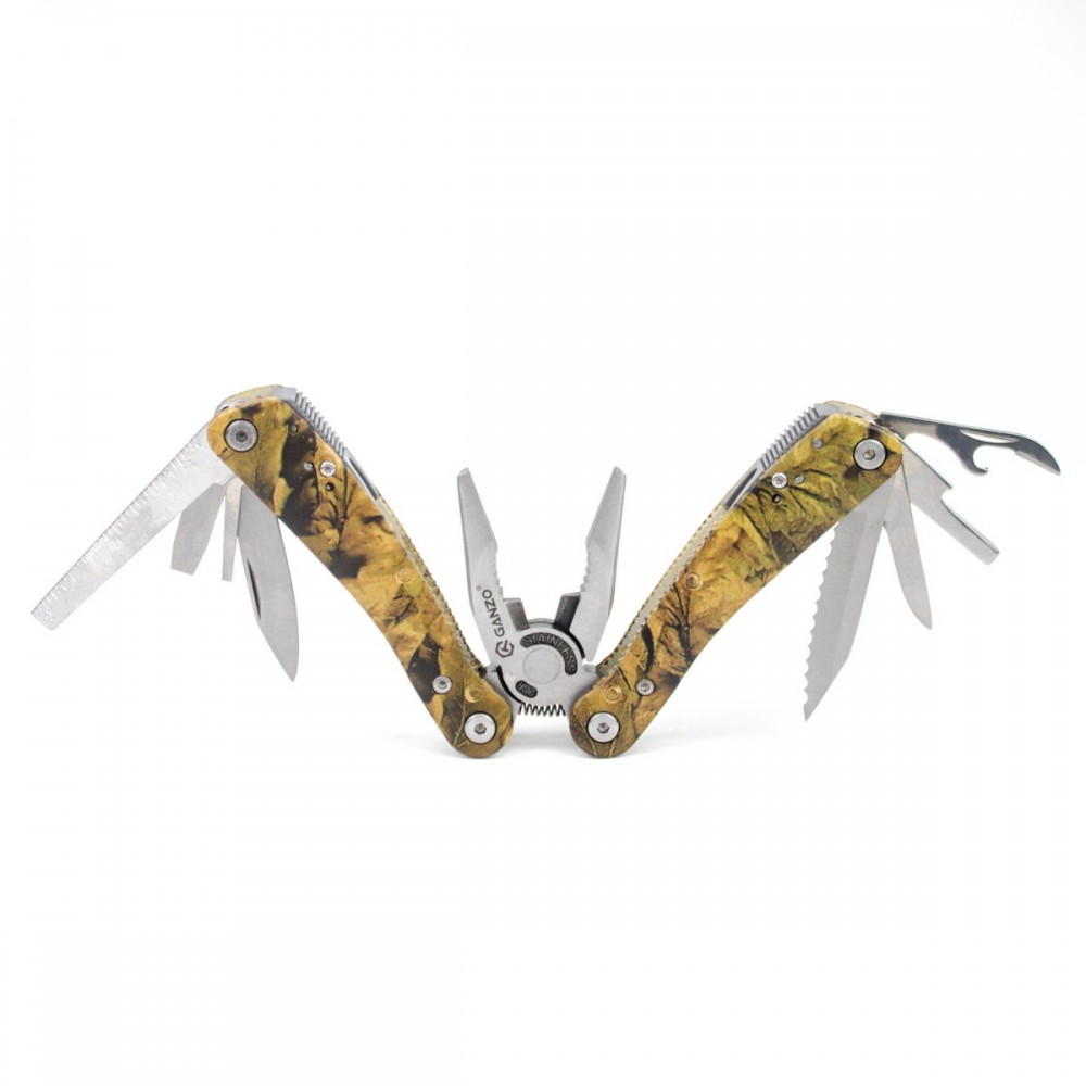 Особенность Ganzo 2016-P — пластиковые накладки на рукоятках с камуфляжным принтом. Кроме интересного окраса мультитул получает практичное свойство скрытого ношения, что удобно во время охоты или выполнения тактических операций. Рукоятки плотно лежат в ладони, а насечки на боковых частях предотвращают скольжение мультитула даже при работе мокрыми руками.