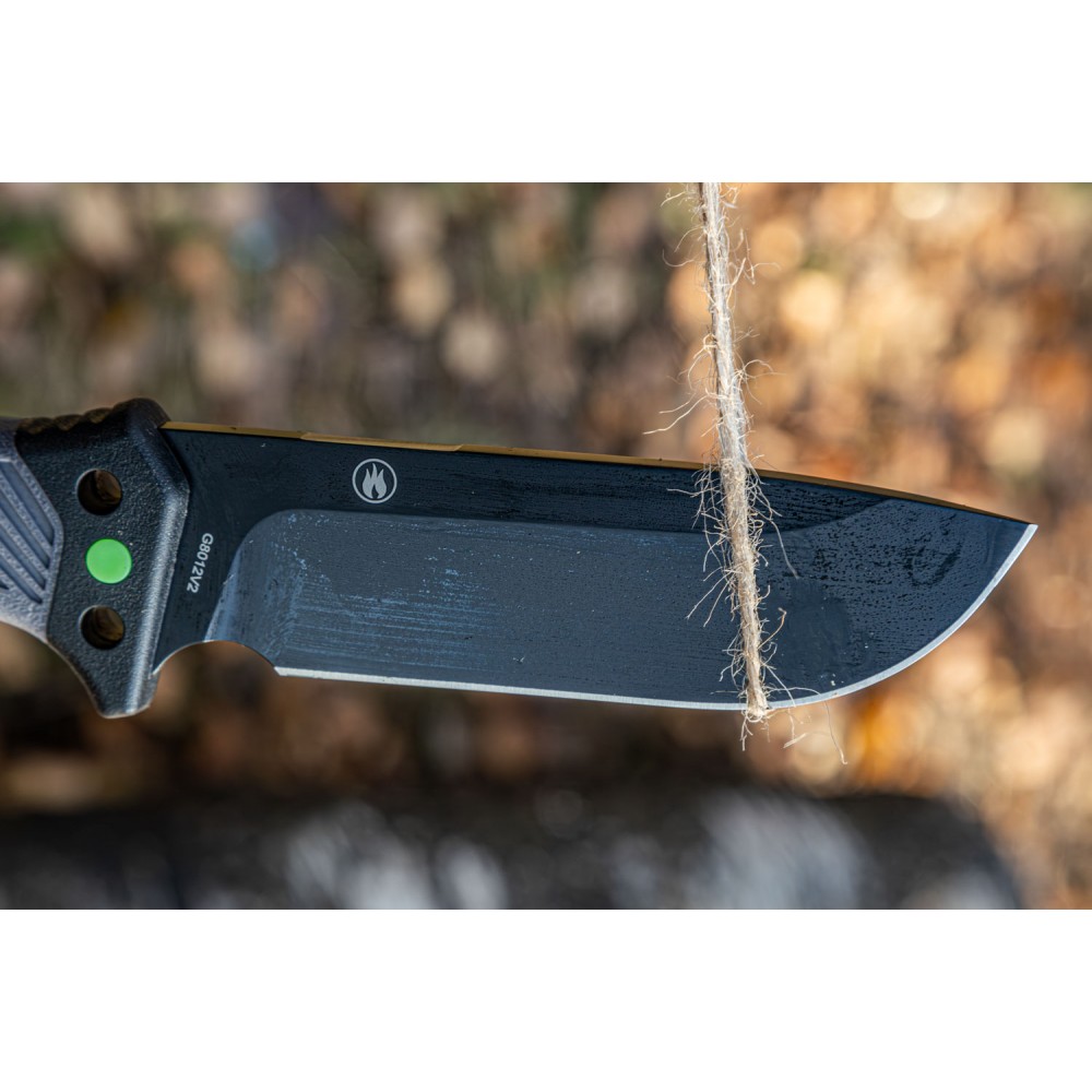 Нож G8012V2-GY является примером качественного и надежного клинка, который можно брать с собой в путешествие и использовать для решения сложных задач, не переживая за его целостность. Лезвие изготовлено из нержавеющей стали 8CR13 с высоким содержанием углерода и хрома, благодаря чему материал приобретает стойкость к коррозии, прочность и твердость порядка 58 HRC. Толщина клинка равна 5 миллиметрам, что позволяет изделию стойко переносить высокие нагрузки без образования сколов и деформаций. Отличительной особенностью ножа является матовое покрытие клинка темного цвета, которое делает модель более стильной и скрывает мелкие царапины, которые появляются на лезвии при продолжительном использовании инструмента.