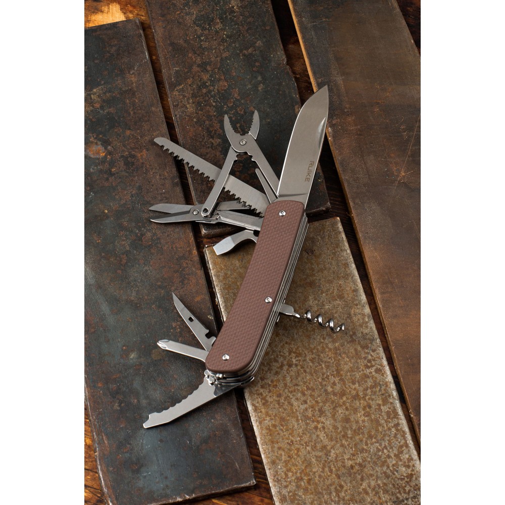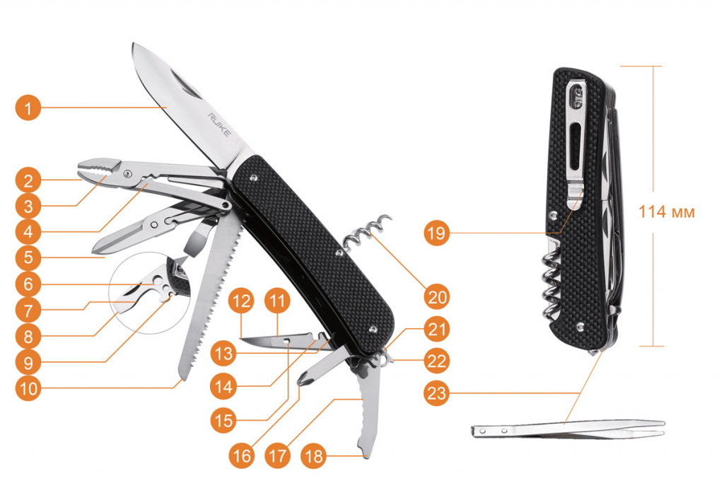 Качественный многофункциональный нож Ruike L51, во многих ситуациях сможет заменить ряд инструментов. Это обусловлено не только продуманностью конструкции, а и его надежностью. Для создания представленного ножа применяются первоклассные материалы. В частности, нержавеющая сталь марки Sandvik 12C27, закаленная до уровня 57-59 HRC. Из неё изготовлены «основной» клинок, небольшие подпружиненные плоскогубцы и ножницы, двухрядная пила, пара отверток (с плоским и крестовым шлицем), многофункциональное шило, лезвие с серрейторной (волнообразной) заточкой, откидное ушко темляка, а также штопор и съемные щипцы. Стеклобой, расположенный в торцевой части, также выполнен из этой стали.