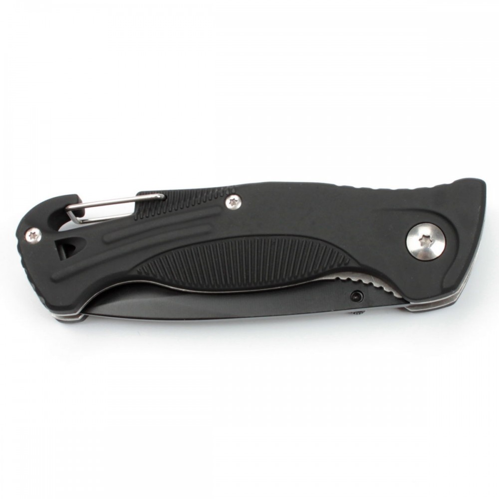 Ручка эргономичной формы отлично ложится в руку. Она сделана из прочного пластика черного цвета. Интегрированный в ручку свисток выделяет эту модель среди других. Этот дополнительный аксессуар может стать незаменимым в экстремальных ситуациях. Не менее полезным будет карабин, имеющийся на ручке. С его помощью нож легко крепится к поясу или снаряжению, и также легко отстегивается. Модель G611 green будет очень полезна для туристов и рыболовов.